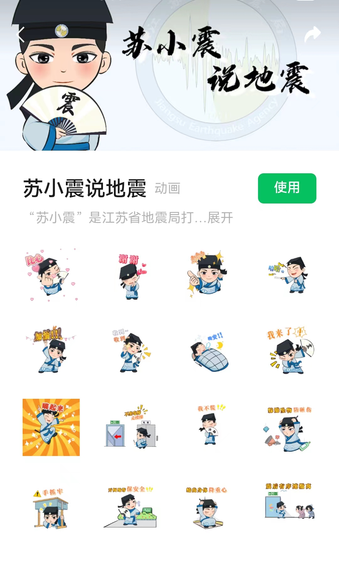 近日,由江苏省地震局原创出品的“苏小震说地震”系列表情包在微信表情开放平台正式上线。“苏小震”是江苏省地震局打造的全新IP形象,剑眉星目、手持折扇的江南书生造型,体现了江苏钟灵毓秀、人杰地灵的特点。该系列表情包以苏小震的IP形象为设计原型,共有16组表情,涵盖了日常交流和专业科普知识,生动活泼地将苏小震形象与防震减灾科普知识有机结合,用群众喜闻乐见的形式传播防震减灾科普知识,提升了苏震科普品牌的辨识度和趣味性。