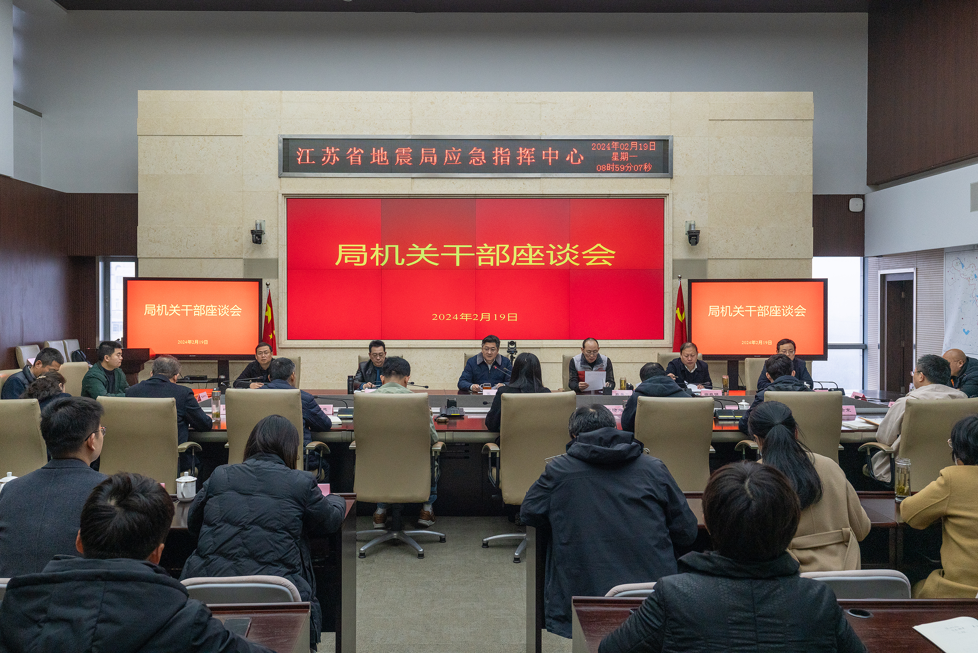 2月19日,江苏省地震局召开机关干部座谈会,党组书记、局长张勤主持会议,党组成员,机关内设机构全体人员,事业单位、中心站主要负责同志参加会议。