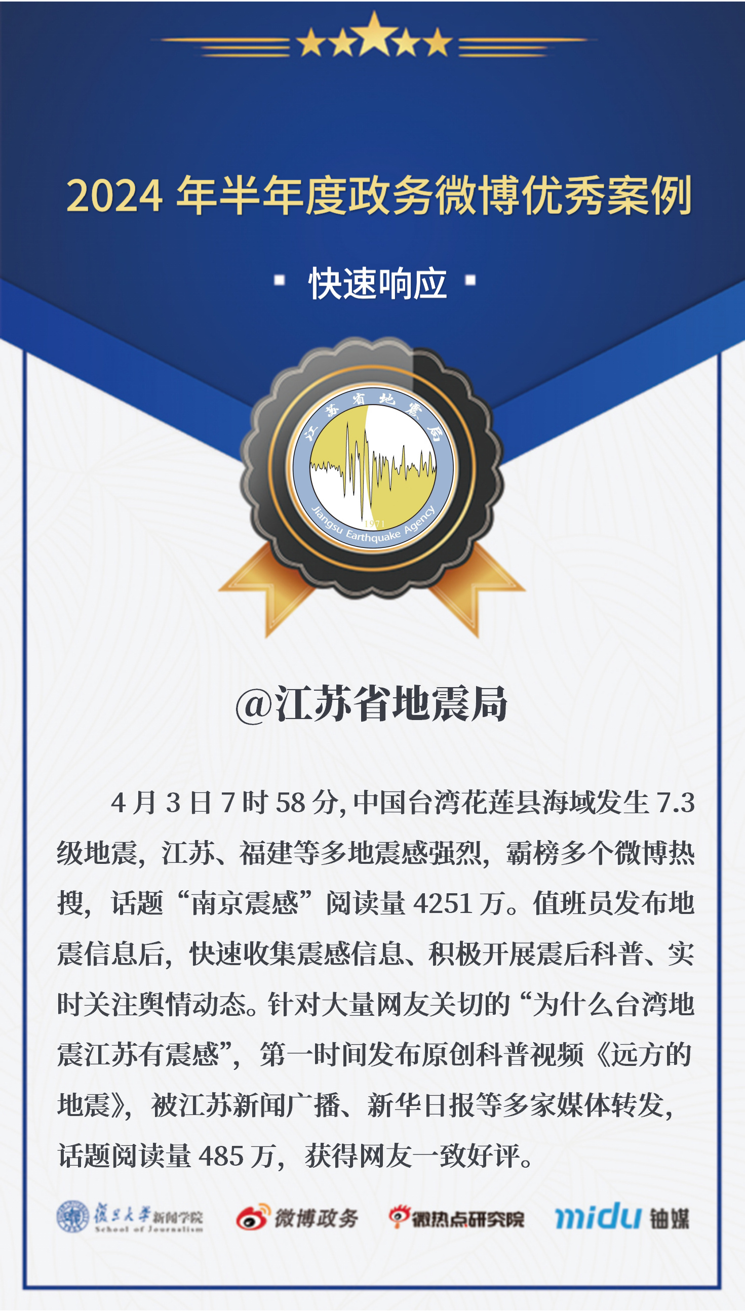 7月以来,“微博政务”联合复旦大学新闻学院、铀媒、微热点研究院共同开展政务微博优秀案例征集活动,涵盖政务公开、政务服务、快速响应、优秀基层、创新应用与传播5大类型。江苏省地震局官方微博“解读台湾地震江苏有震感”案例在全国众多案例中脱颖而出,获得2024年上半年政务微博“快速响应”类优秀案例奖。