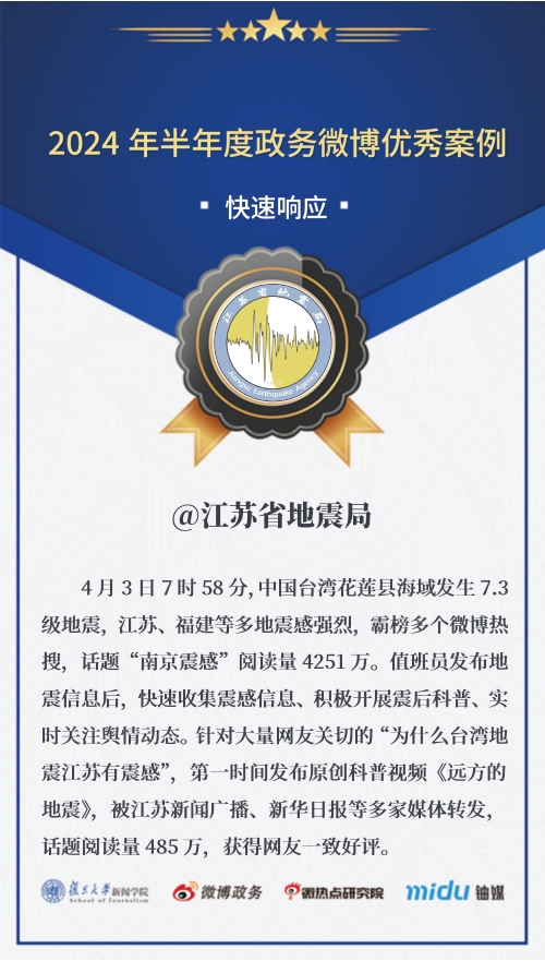 近日,江苏省地震局官方微博获评2024年上半年政务微博“快速响应”类优秀案例奖。